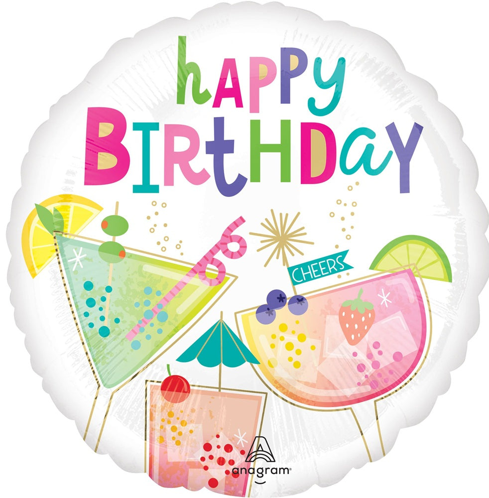 18 inch Alcohol Drink Cocktail Happy Birthday Foil Balloon. Helium filled with ribbon. WEIGHT NOT INCLUDED