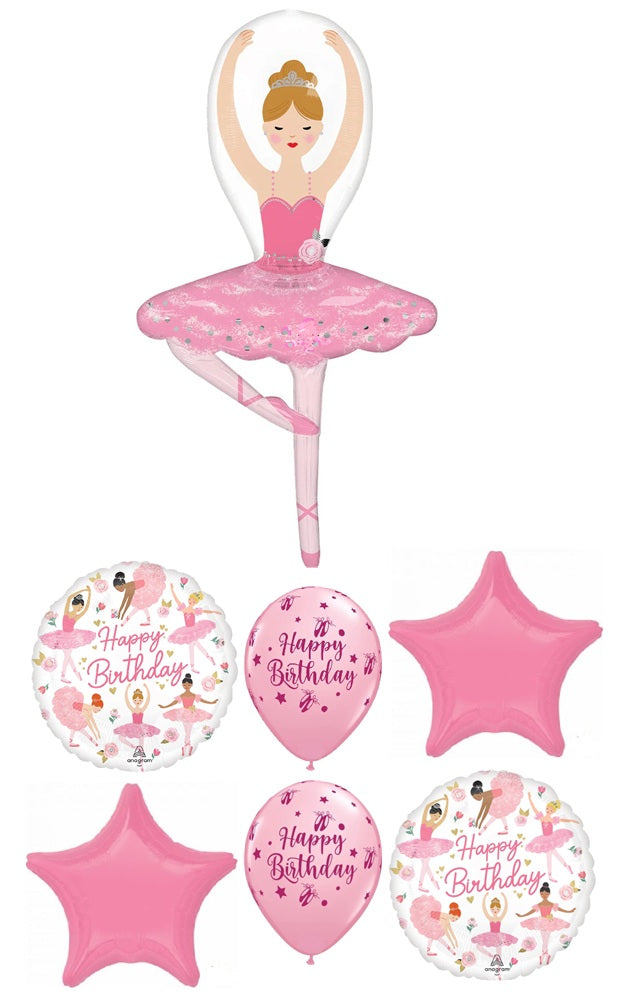 43 inch Ballerina Girl Star Birthday Balloon Bouquet. Helium filled balloons with ribbon and weight. Latex balloons treated with Hi Float to extend float time