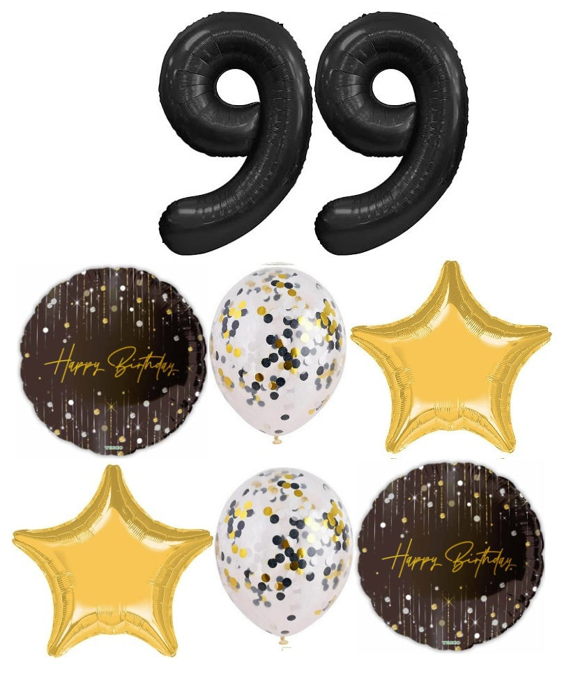 Adult Birthay Pick An Age Black Numbers Sparkle Confetti Balloons Bouquet. Helium filled Hi-Float treated Balloons with ribbon and weight. PUT THE AGE TWO NUMBERS IN NOTES