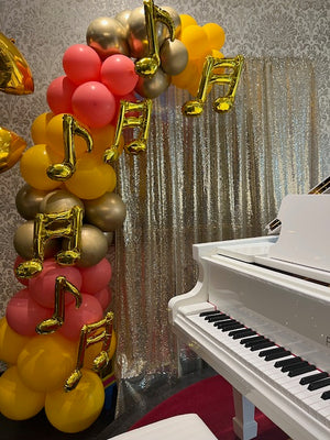 7 Foot Gold Musical Notes Garland Balloon Arch. Air filled balloons on pole and base. Pole and base to be returned